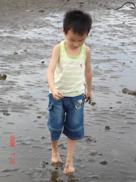 只要是小朋友無不喜歡玩沙的,只要是小朋友無不喜歡玩水的,何況可以同時玩沙又玩水,剛好是退潮的時候,水位似乎比往常的低,就讓楷恩下去玩玩沙吧!乾乾的沙燙腳,那就玩玩有水的沙。